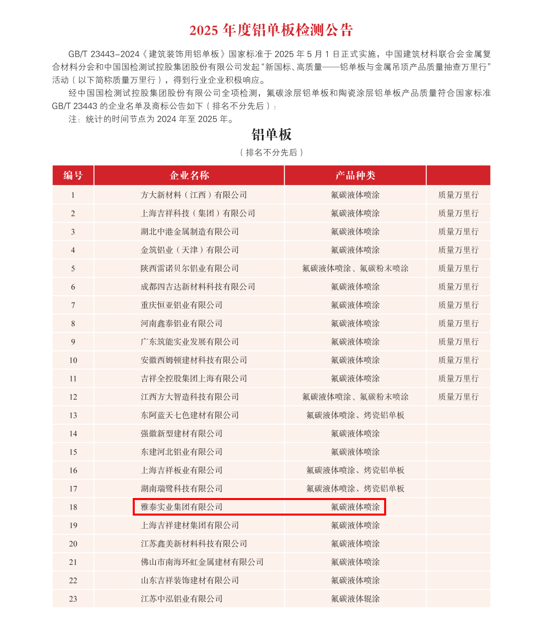 雅泰實(shí)業(yè)集團(tuán)2025年度多項(xiàng)產(chǎn)品全項(xiàng)檢測合格公示