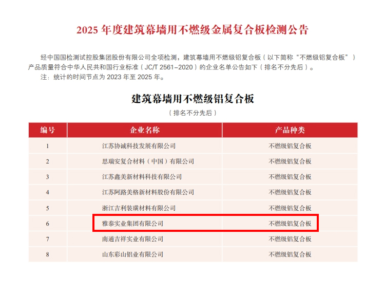 為加強(qiáng)金屬復(fù)合材料行業(yè)品質(zhì)建設(shè),提高行業(yè)整體質(zhì)量,金屬復(fù)合材料分會聯(lián)合中國國檢測試控股集團(tuán)股份有限公司對符合全項(xiàng)檢測要求的鋁塑復(fù)合板、鋁單板、建筑裝飾用不燃級金屬復(fù)合板、鋁蜂窩復(fù)合板和鋁波紋芯復(fù)合鋁板等生產(chǎn)企業(yè)頒發(fā)2025 年度產(chǎn)品合格證,具體公告如下: